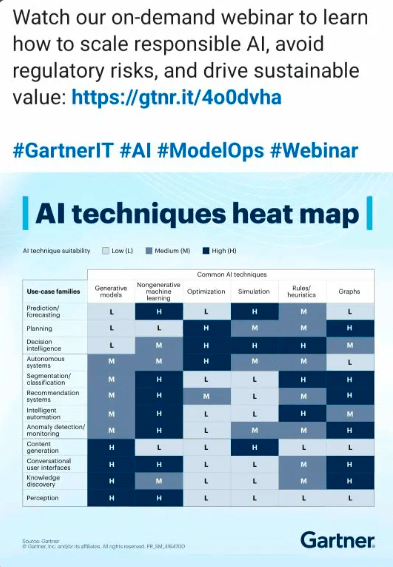 Gartner just published an “AI Techniques Heat Map” — a matrix matching AI approaches (Generative Models, Optimization, Simulation, etc.) to use cases (Prediction, Planning, Decision Intelligence, etc.) with Low/Medium/High suitability ratings.