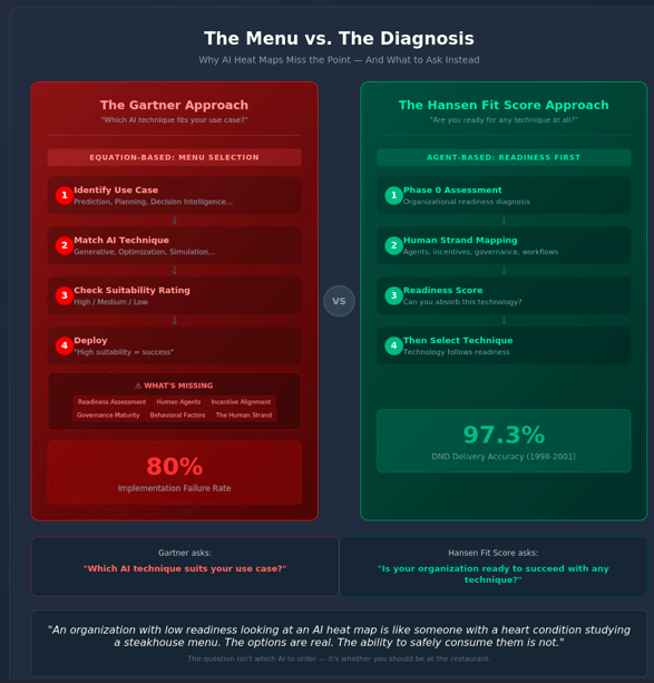 And it will contribute to the next wave of the 80% failure rate — because it tells organizations what to order without ever asking if they should be at the restaurant.
