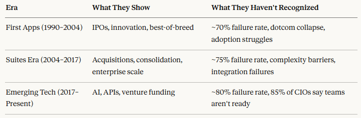 The technology timeline shows what vendors built. The failure rate shows what customers experienced.