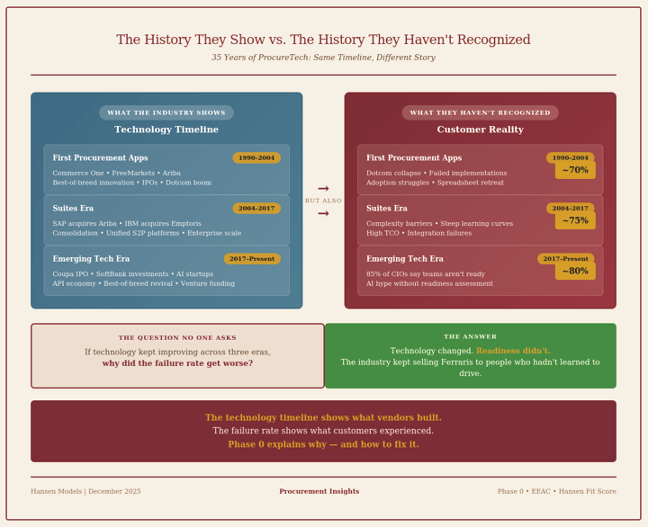 35 years of ProcureTech timelines celebrate what vendors built. The failure rate reveals what customers experienced. Here’s the equation that explains both — and what the industry is finally starting to see.