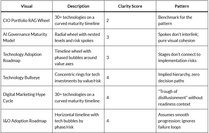 I recently published a critique of Gartner’s “CIO Board Presentation Prep” wheel — a RAG assessment graphic so dense with encoding systems (colors, shapes, triangle orientations) that I couldn’t parse it. Neither could five AI models I tested it against. Neither, it turns out, could a growing list of CPOs, analysts, and AI professionals who’ve since admitted the same confusion.