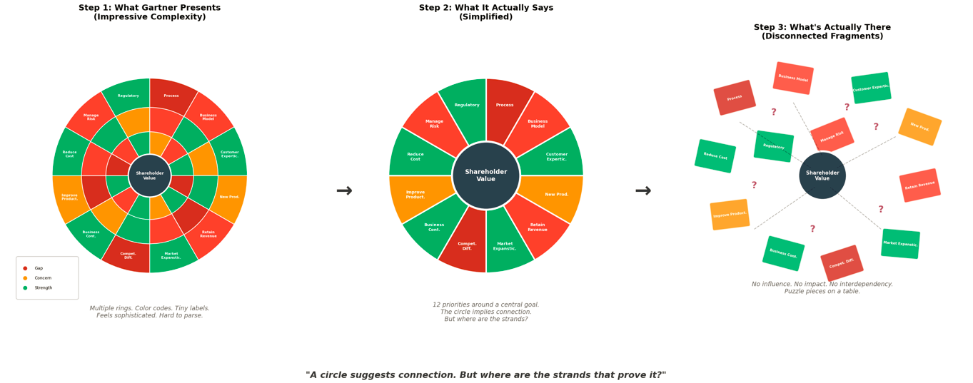 Step 1: What Gartner Presents Multiple rings. Color codes. Tiny labels. Shapes within shapes. It feels sophisticated. It’s hard to parse. That’s the point.
