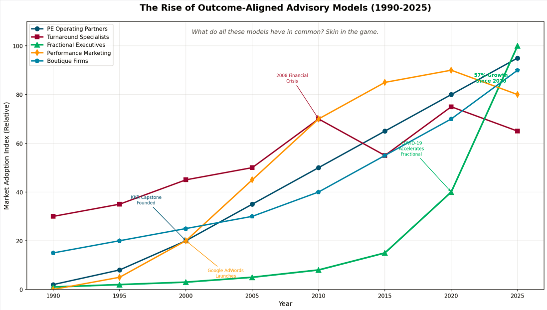 The attached trend line (1990–2025) isn’t just a story about new advisory models. It’s a story about where accountability is being pushed when failure tolerance collapses.