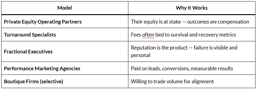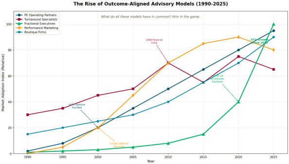This graph tracks the 35-year evolution of five advisory models that share a common characteristic: skin in the game. The most striking pattern is the explosive rise of fractional executives (green line), which remained nearly flat from 1990 through 2015, then accelerated dramatically post-COVID to become the fastest-growing model by 2025. PE Operating Partners and Boutique Firms show steady, consistent growth over the entire period, reflecting institutional recognition that outcome alignment produces better results. Performance Marketing peaked around 2020 and has since declined — a warning signal that outcome measurement alone isn’t enough once it becomes commoditized. Turnaround Specialists remain cyclical, spiking during crises (2008, 2020) but otherwise stable. The subtitle asks the essential question: What do all these models have in common? Skin in the game.