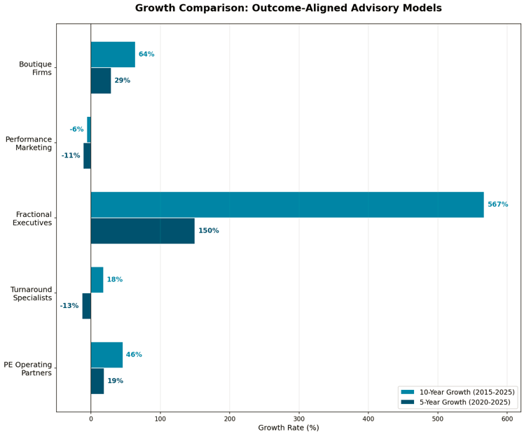 This horizontal comparison makes the growth differential impossible to ignore. Fractional executives dominate with 567% ten-year growth and 150% five-year growth — numbers that dwarf every other model. Boutique firms show healthy acceleration (64% / 29%), while PE Operating Partners demonstrate steady institutional adoption (46% / 19%). The negative bars tell an equally important story: Performance Marketing (-6% / -11%) shows what happens when outcome metrics become commoditized, and Turnaround Specialists (-13% in 5-year) reflect cyclical demand tied to economic conditions rather than structural growth. The visual hierarchy is immediate — the models with the most direct fee-outcome linkage are growing fastest.