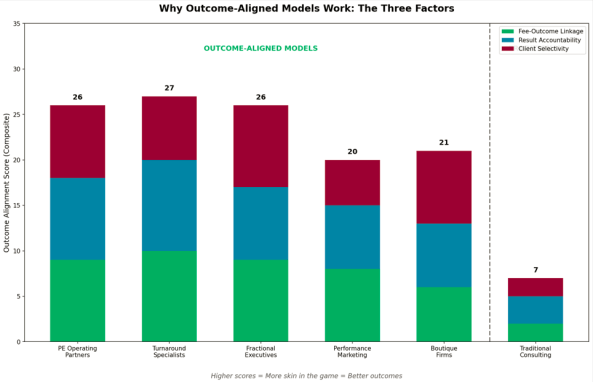 This graph deconstructs why certain models outperform by scoring each on three factors: Fee-Outcome Linkage (green), Result Accountability (blue), and Client Selectivity (burgundy). Turnaround Specialists score highest (27) because survival metrics create absolute accountability — the company either lives or dies. PE Operating Partners and Fractional Executives tie at 26, reflecting equity stakes and reputation-as-product dynamics respectively. The critical insight is the dashed line separating outcome-aligned models (scores 20-27) from Traditional Consulting (score 7). The gap isn’t marginal — it’s a 3x-4x difference in structural alignment. The bottom caption states the thesis directly: Higher scores = More skin in the game = Better outcomes.