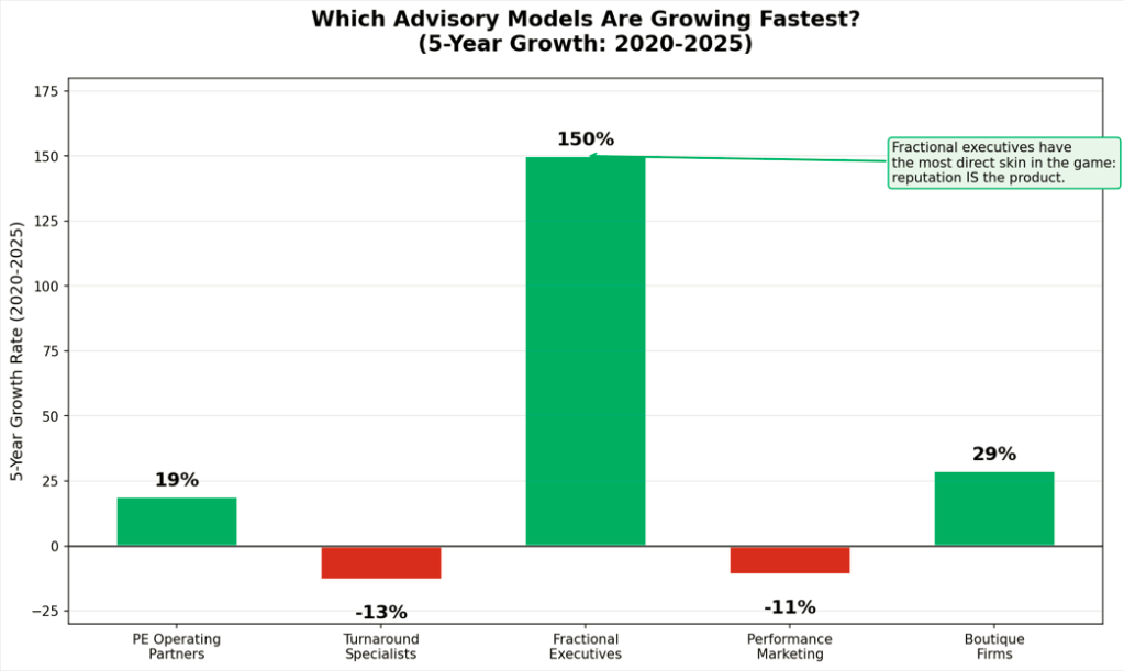 This is the simplest and most powerful visualization. By focusing only on 5-year growth (2020-2025), it shows what the market is choosing right now. The green bars (positive growth) versus red bars (negative growth) create instant clarity. Fractional Executives tower above everything at +150%, with Boutique Firms (+29%) and PE Operating Partners (+19%) showing solid growth. The red bars — Turnaround Specialists (-13%) and Performance Marketing (-11%) — represent models that are either cyclical or commoditizing. The callout box states the thesis: Fractional executives have the most direct skin in the game: reputation IS the product. This is the graph to use when you need one image to prove that the market is already voting for outcome-aligned models.