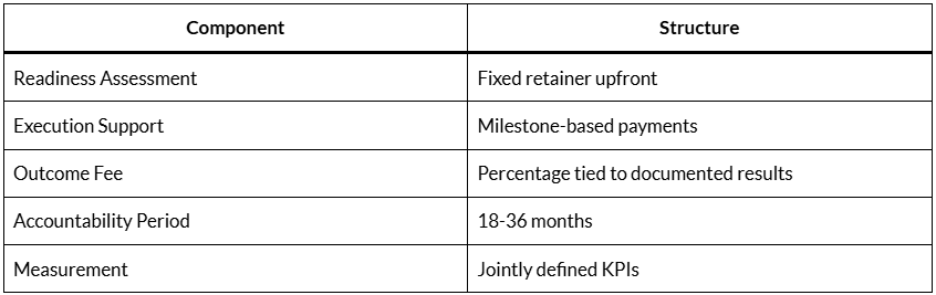 This works because the contract separates advice from implementation, deliverables from outcomes, recommendations from results.