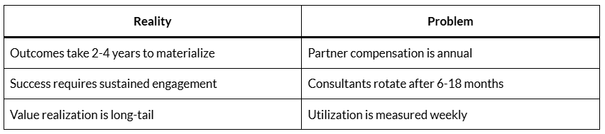 The entire economic architecture of consulting — from associate utilization to partner profit-sharing — is built on short-cycle metrics.
