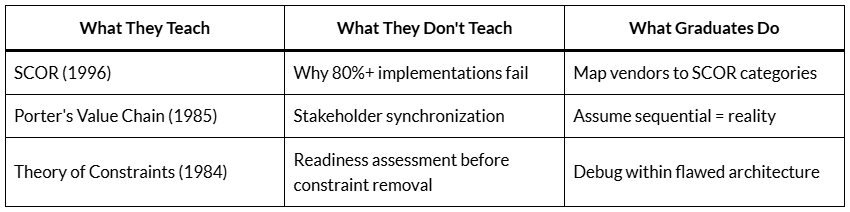 Still Teaching the Gap: Why SCOR, TOC, and Porter Don’t Explain the Failure Rate