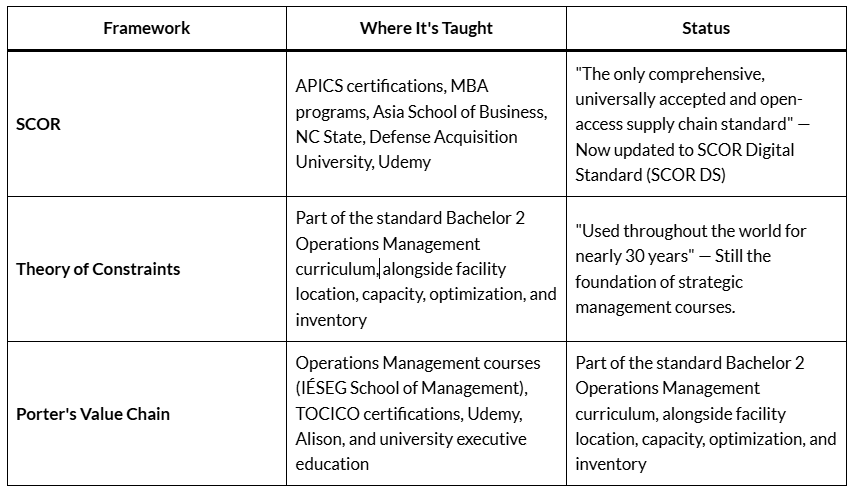 - The curriculum doesn’t explain it — Porter, SCOR, TOC are taught as complete frameworks