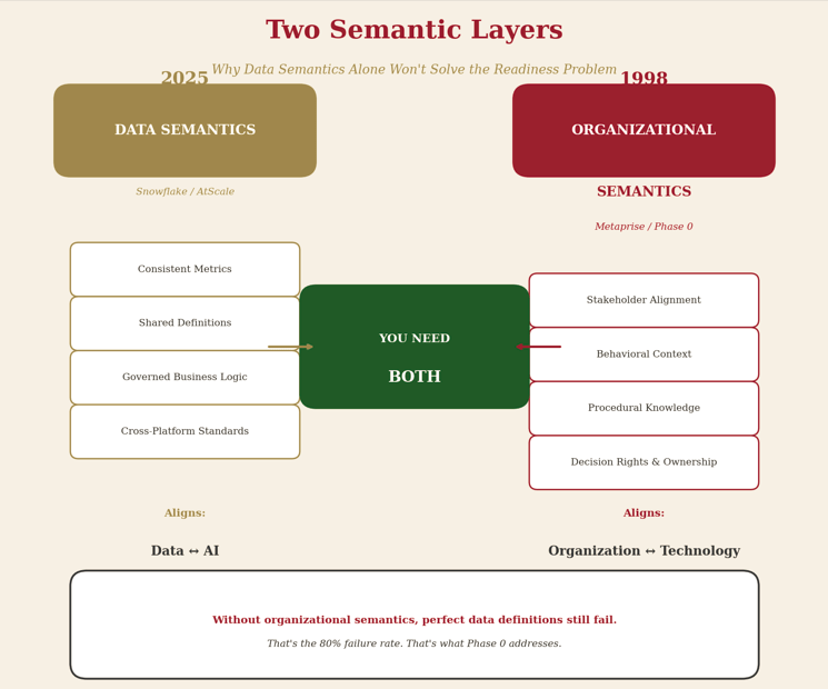 Data semantics alone won’t solve the readiness problem. You also need organizational semantics — shared meaning across stakeholders, not just shared definitions across databases.