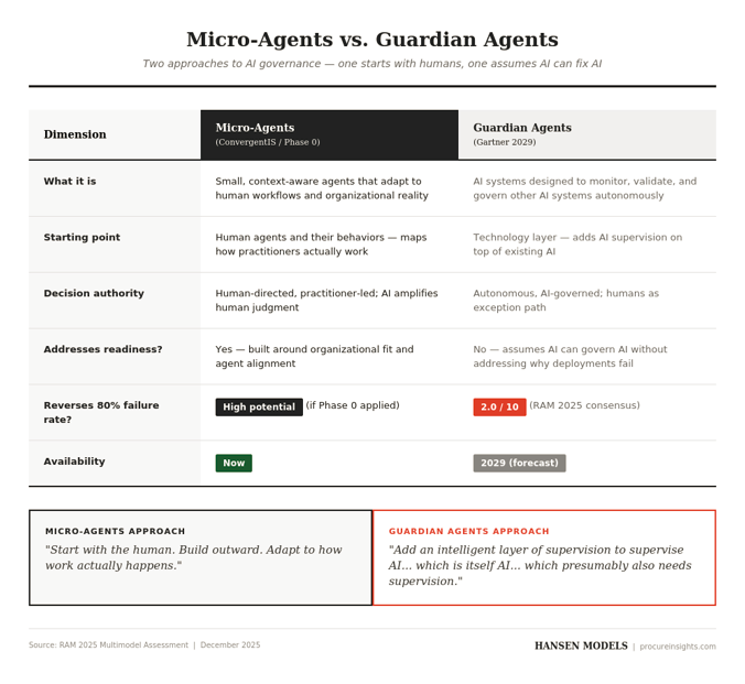 Why? Because Guardian Agents add a technology layer on top of a technology problem. Micro-agents—like ConvergentIS’s approach—start with the human and build outward. Guardian Agents assume AI can govern AI without addressing why deployments fail in the first place.