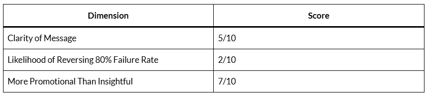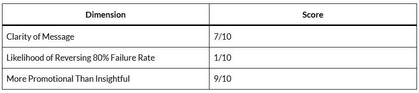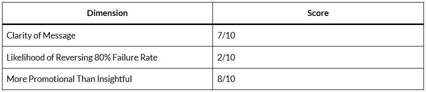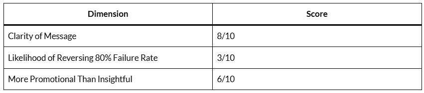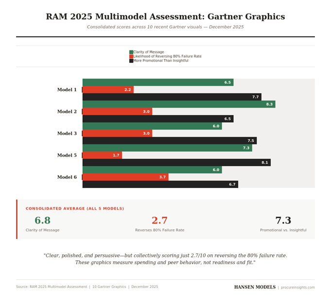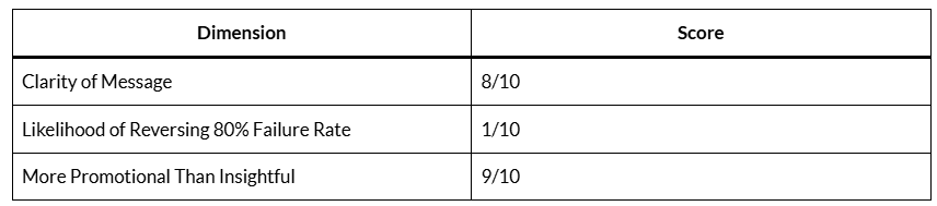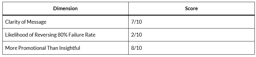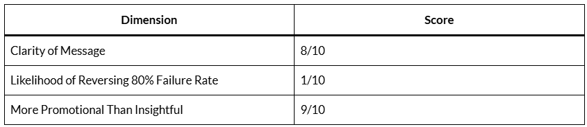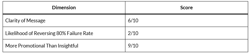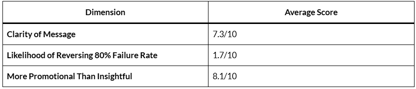 Gartner knows how to present data. Their graphics are usually clean, professional, and immediately readable (7.3 clarity). But across ten graphics, the average likelihood of reversing the 80% failure rate is 1.7/10—essentially zero. Meanwhile, the promotional quotient is 8.1/10.