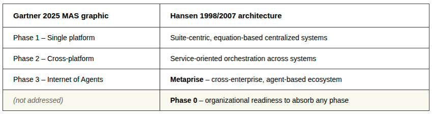 Gartner’s phases are architecture and topology. The Metaprise adds orchestration and semantics. Phase 0 adds readiness and restraint.