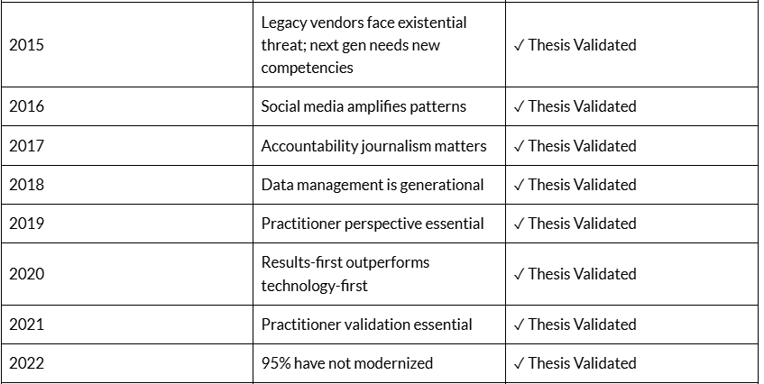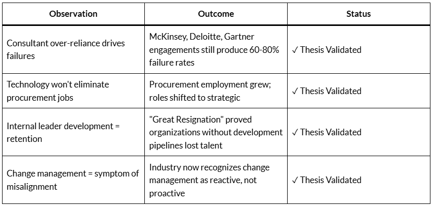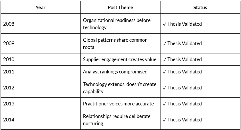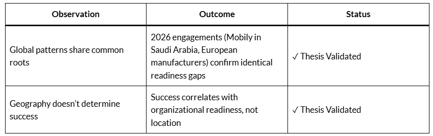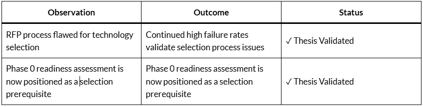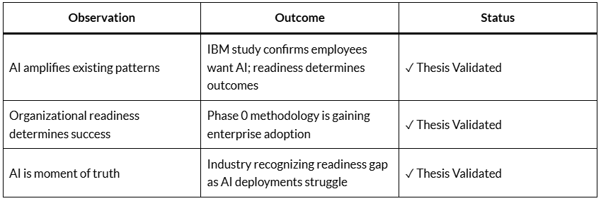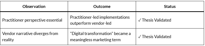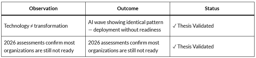 The messiness of real-world validation doesn’t allow for clean, binary scoring of every individual forecast. What it does allow is something more meaningful: longitudinal confirmation that the core thesis was never falsified. Different tools, different vendors, different eras — same failure mechanics when readiness was ignored.