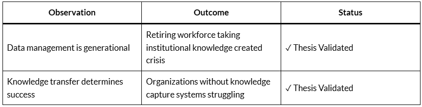 Core Thesis: Data management is a generational challenge. Knowledge transfer across organizational generations determines long-term success.