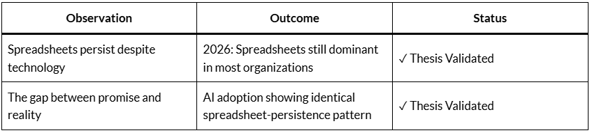 2026 Reflection: Organizations buy technology but continue using spreadsheets because the underlying organizational readiness was never established. Same pattern, every wave.