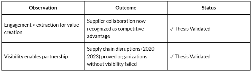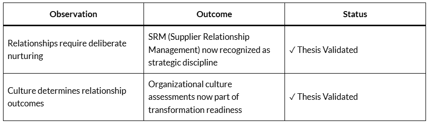2026 Reflection: COVID-19 supply chain disruptions validated this thesis catastrophically. Organizations with transactional supplier relationships collapsed. Those with engaged partnerships adapted.