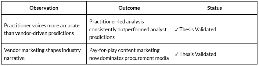 Core Thesis: Industry predictions often reflect vendor marketing agendas rather than practitioner reality. Featuring practitioner voices provides more accurate forecasting.