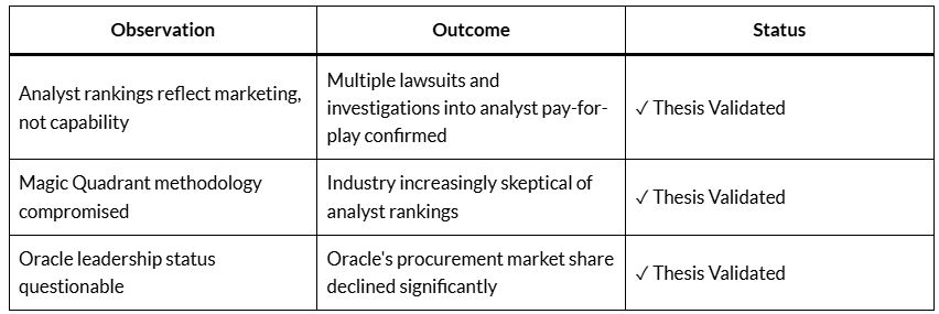 Core Thesis: Analyst rankings reflect marketing spend and vendor relationships more than actual capability or implementation success. Gartner’s “Magic Quadrant” methodology is compromised.