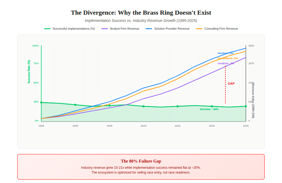 Graph 1 shows the divergence: Industry revenue grew 15-21x while implementation success remained flat at ~20%. The ecosystem is optimized for selling race entry, not race readiness.