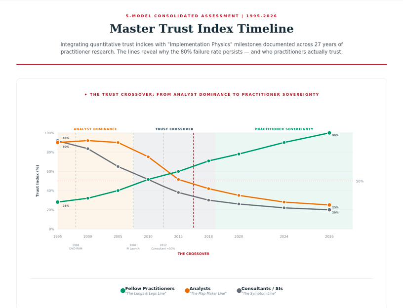 Graph 2 shows the consequence: Practitioner trust in analysts and consultants collapsed from 80%+ to 20-25% over the same period. Trust in fellow practitioners rose from 28% to 90%.