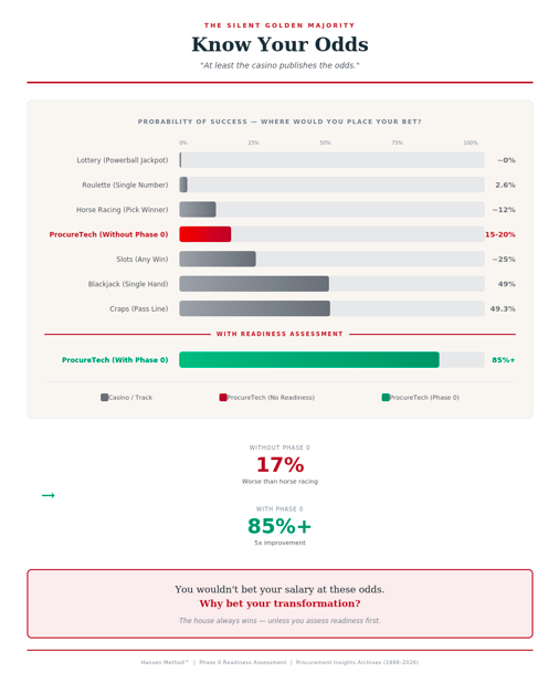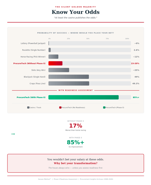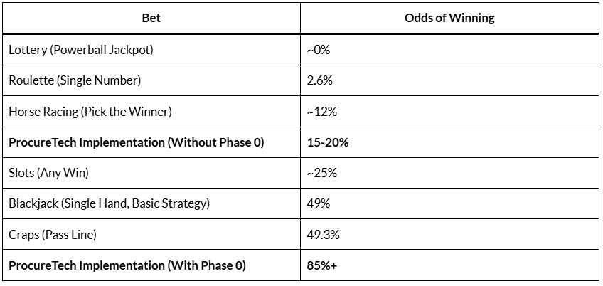 You have better odds at a blackjack table than implementing procurement technology without a readiness assessment. At least the casino publishes the odds.