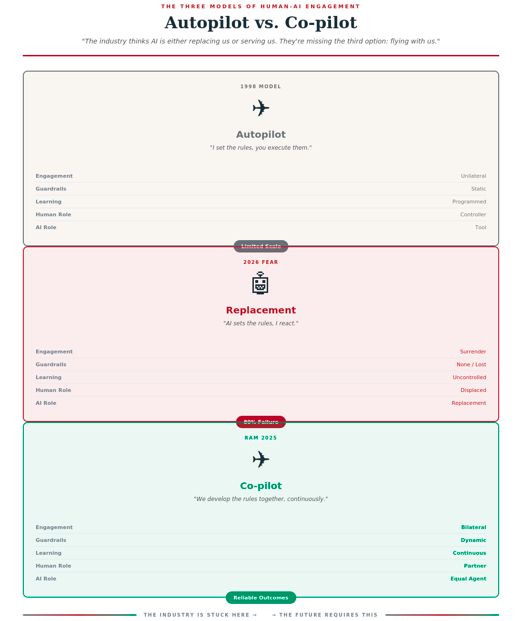 The answer isn’t more control (1998 autopilot). The answer isn’t less control (2026 surrender). The answer is shared governance — human and AI co-developing the guardrails through continuous engagement.