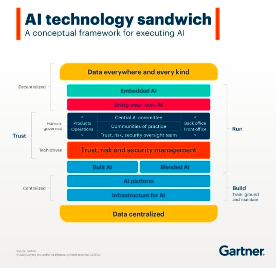 Gartner calls their latest framework an “AI Technology Sandwich.” And it looks like one — a multi-patty, fully-loaded burger stacked with layers: data everywhere, embedded AI, bring-your-own AI, central AI committees, trust and security management, built AI, blended AI, platforms, infrastructure, and data centralized at the bottom.