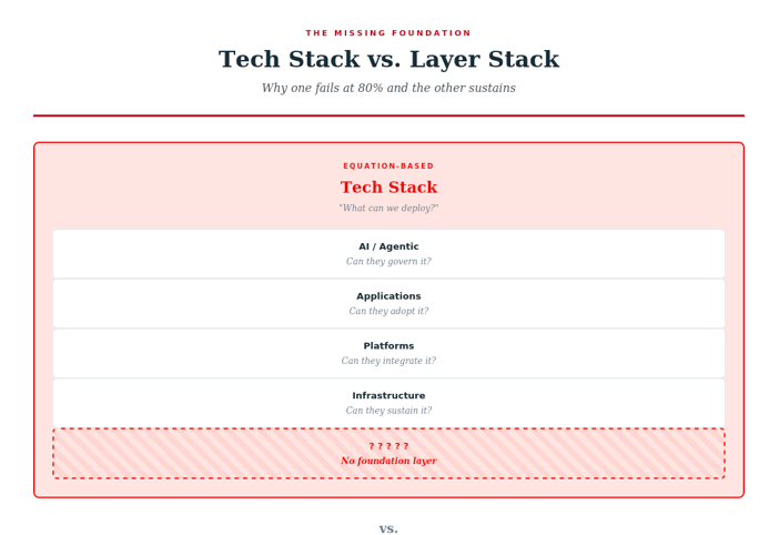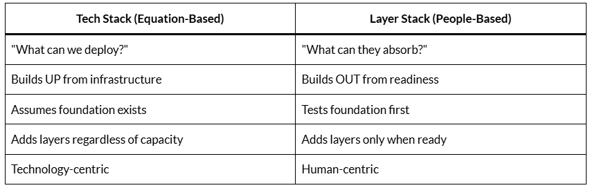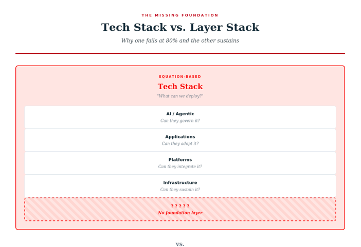 Tech stacks assume readiness. They build upward from infrastructure, adding layers regardless of organizational capacity to absorb them. And every five years, a new technology era arrives — with a new stack to sell.