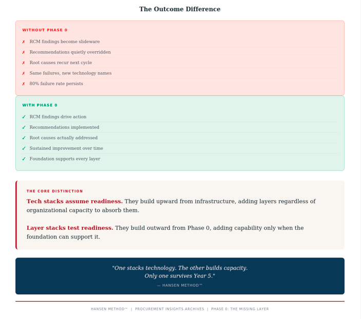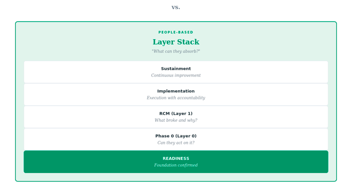 RCM answers: What broke and why? Phase 0 answers: Is this organization capable of acting on that insight without repeating the same failure next cycle?
