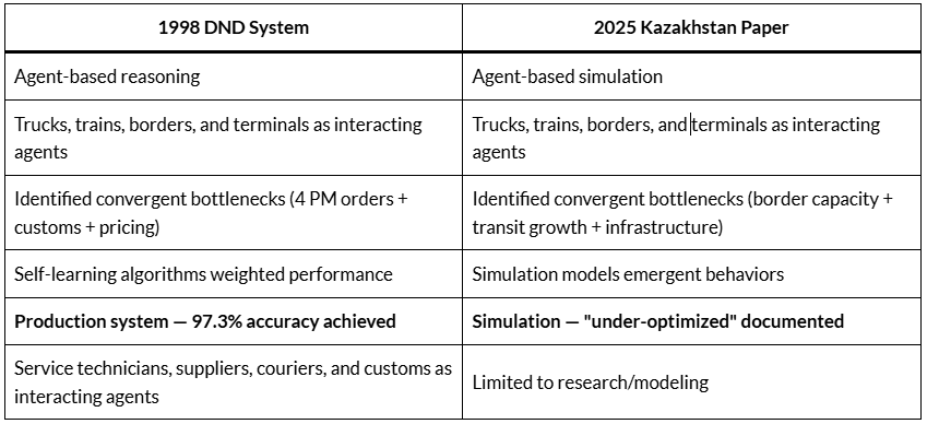 The Kazakhstan researchers can model the optimal solution. But their paper explicitly identifies “infrastructure bottlenecks, uneven cargo flows, and limited digital tools” as barriers.