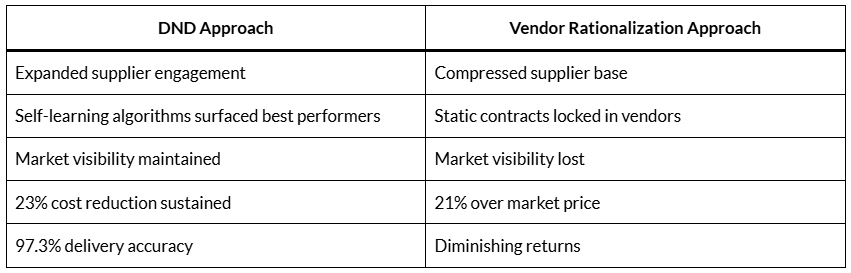 The DND system worked because it treated the market as a dynamic system of agents. The vendor rationalization failed because it assumed the market could be controlled through compression.