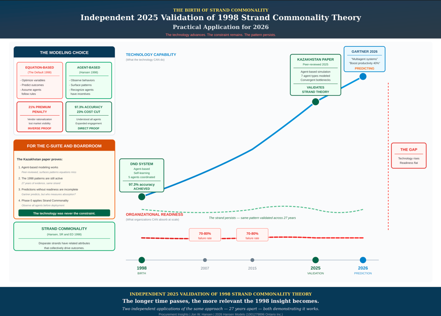Jon Hansen developed Strand Commonality Theory in 1998, funded by Canada’s SR&ED program. The agent-based procurement system he built for the Department of National Defence achieved 97.3% delivery accuracy and 23% cost reduction — results validated by 27 years of consistent evidence and now by peer-reviewed academic research. His methodology — the Hansen Fit Score — applies the same principle: observe all the agents, measure the convergent patterns, assess readiness before deployment. Because the technology has never been the constraint.