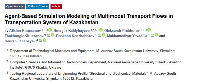 In November 2025, a peer-reviewed paper was published in Logistics journal: “Agent-Based Simulation Modeling of Multimodal Transport Flows in Transportation System of Kazakhstan” (Khussanov et al.).