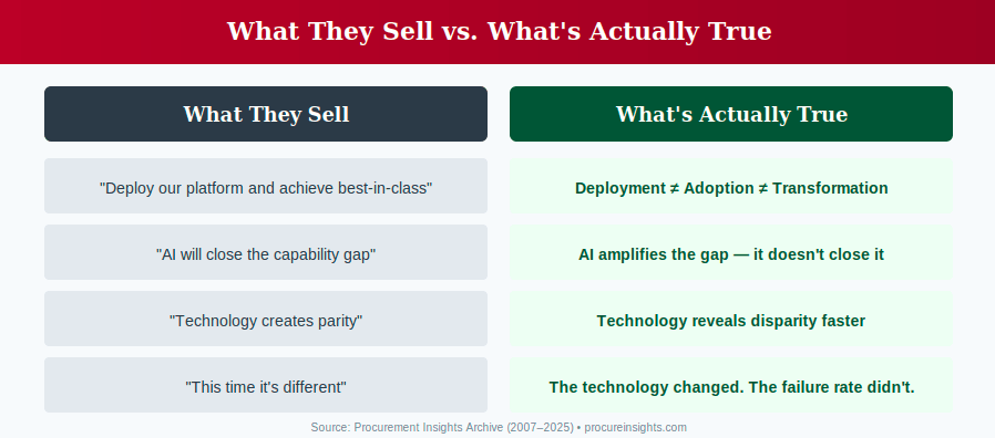 Technology is not, nor will it ever be, the great equalizer that elevates procurement’s performance to a “best-of-breed” level by its mere introduction into an organization. Unfortunately, that is what analysts, consultants, and solution providers sell — parity where none exists.