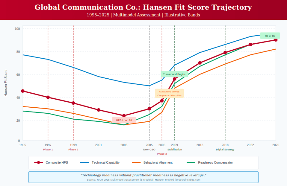 Recently, I was asked to use the five models of RAM 2025 to build a hypothetical Level 1 Hansen Fit Score trajectory for a major telecommunications company’s 30-year transformation — from government monopoly (1995) through acquisition turbulence (1997-2006) to digital maturity (2025).