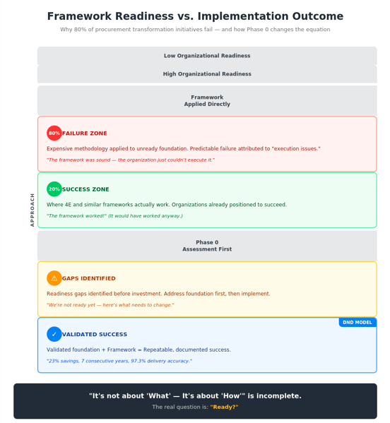 That’s the implementation gap. That’s what Phase 0 solves. And that’s why 80% of procurement transformation initiatives continue to fail — not because the frameworks are wrong, but because they’re applied to organizations that aren’t prepared to execute them.