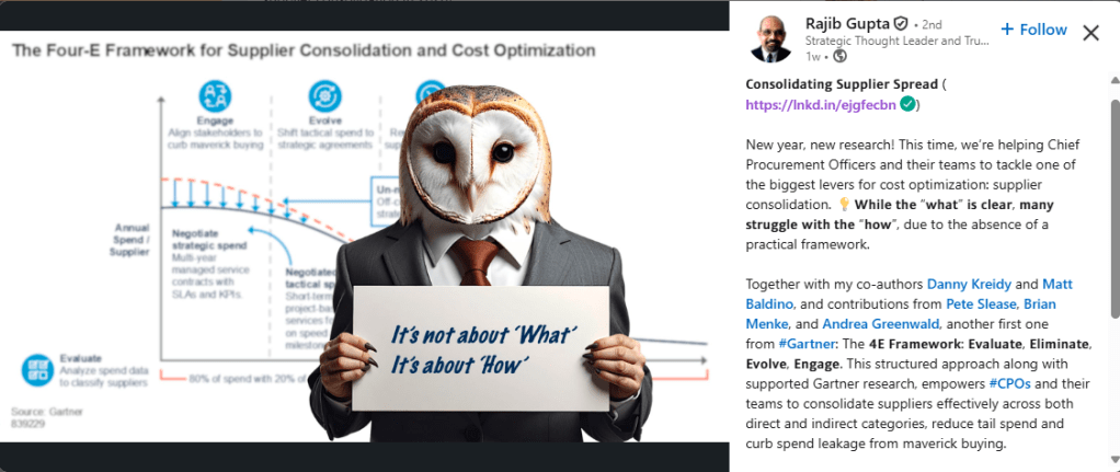 A LinkedIn post crossed my feed this morning from Rajib Gupta, promoting a “4E Framework” for supplier consolidation. The tagline: “It’s not about ‘What’ — It’s about ‘How’.” Co-authored with Danny Kreidy, Matt Baldino, and contributions from Pete Slease, Brian Menke, and Andrea Greenwald, it presents Evaluate, Eliminate, Evolve, Engage as a structured approach to reducing tail spend and curbing maverick buying.
