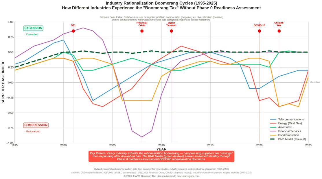 Every major industry—Telecommunications, Energy, Automotive, Financial Services, Food Production—exhibits the same rationalization boomerang. No sector escapes it without Phase 0. The question isn’t whether the pattern exists; it’s whether your organization will be the exception or the rule.