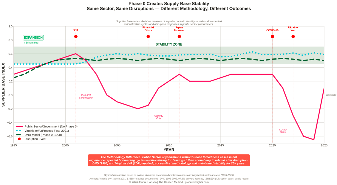 Same sector, same disruptions—9/11, Financial Crisis, COVID-19—but radically different outcomes. While public sector organizations without Phase 0 experienced repeated collapse and rebuild cycles, the Department of National Defence (1998) and Virginia eVA (2001) maintained stability for 25+ years through process-first methodology.