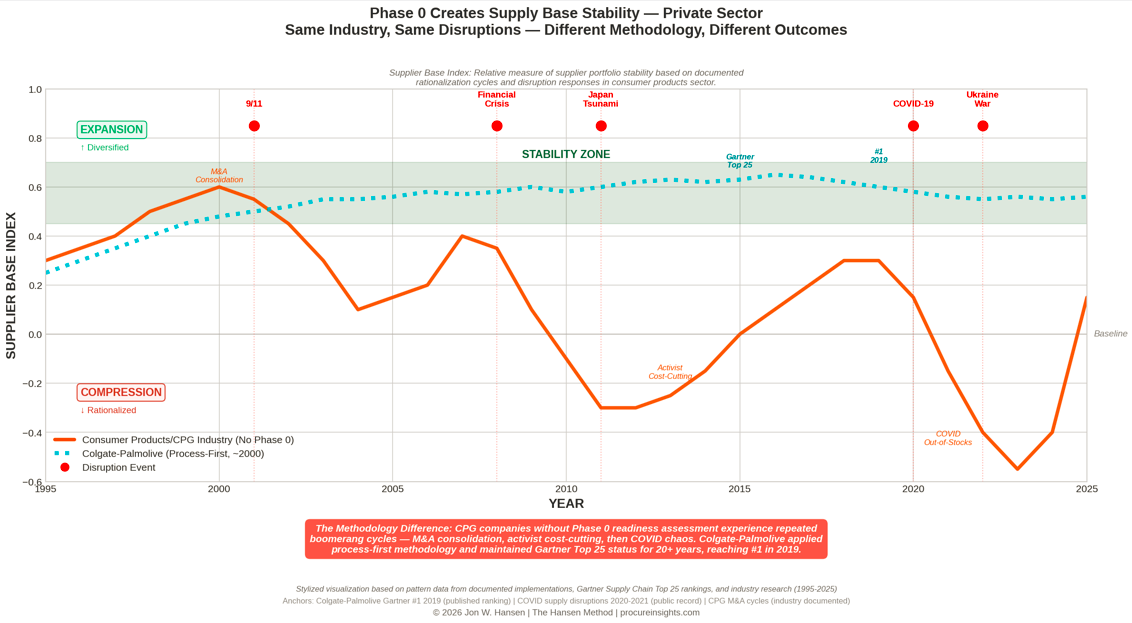 Index definition: The Supplier Base Index needs a one-sentence definition on every chart. If it’s stylized/illustrative, say so clearly. That turns “This is made up” into “This is a conceptual index illustrating the pattern logic.”