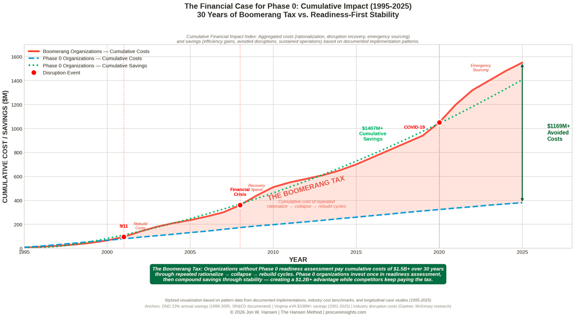 The Boomerang Tax isn’t abstract—it’s $1.2B+ in avoidable costs over 30 years. Phase 0 isn’t an expense; it’s a hedge against predictable, repeated failure. Organizations that invest once in readiness assessment compound savings through stability while competitors keep paying the tax.