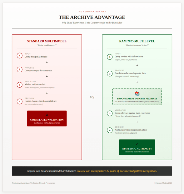 The Procurement Insights Archives function differently. They’re contemporaneous, timestamped observations tied to outcomes. When RAM 2025 surfaces a pattern — say, that behavioral misalignment predicts implementation failure more reliably than technical readiness — I can trace that insight to specific engagements, specific decision points, and measurable results.