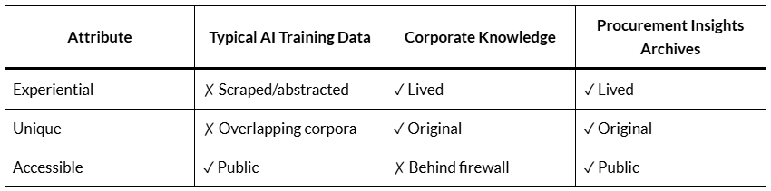 That archive — 27 years of the Procurement Insights blog and client engagements — isn’t retrospective data. It’s contemporaneous, timestamped evidence tied to outcomes.