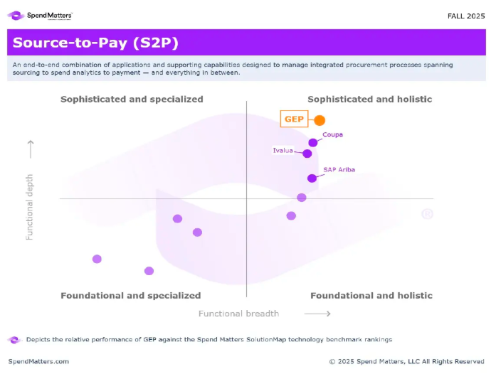 Depicts the relative performance of GEP against the Spend Matters SolutionMap technology benchmark rankings — Fall 2025