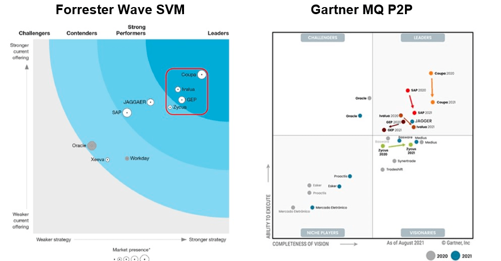 Side-by-side comparison of analyst firm rankings — Forrester Wave SVM and Gartner Magic Quadrant P2P