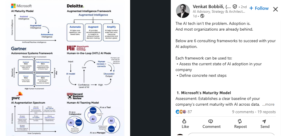 Six consulting frameworks for AI adoption: Microsoft Maturity Model, PwC Collaboration Spectrum, Deloitte Augmented Intelligence, Gartner Autonomous Systems, MIT Human-in-the-Loop, and HBR Teaming Model
