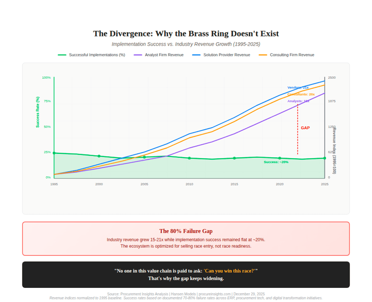 Implementation Success vs. Industry Revenue Growth (1995-2025) — Revenue grows while success rates remain flat at ~20%
